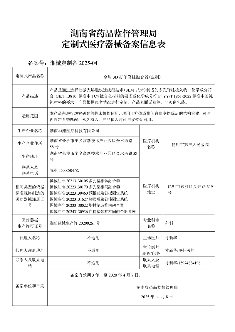 定制式博天堂娱乐备案信息表(湘械定制备2025-04)